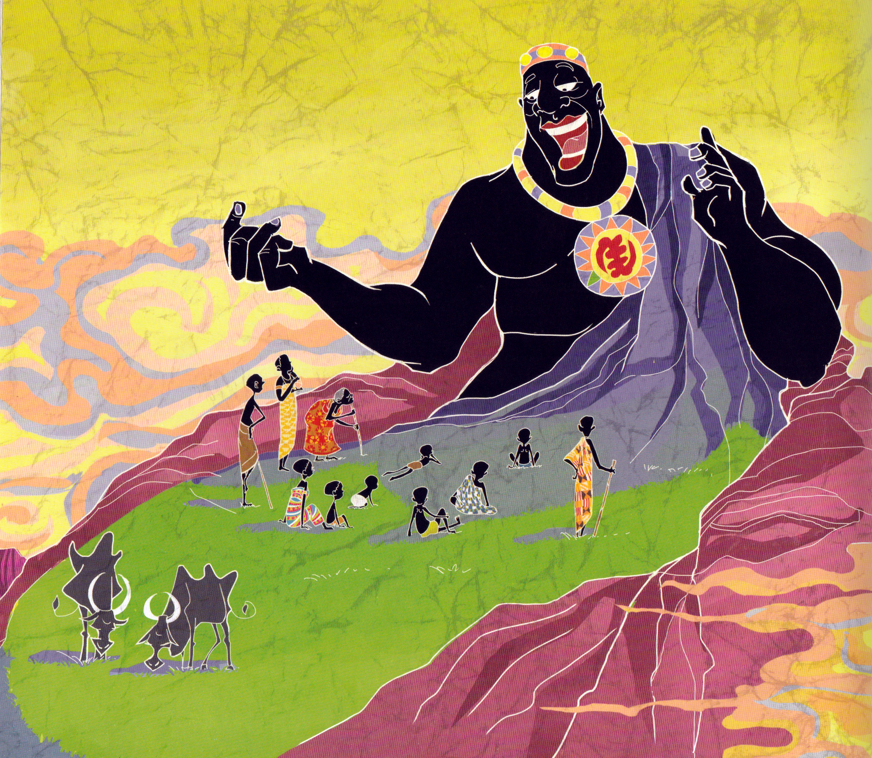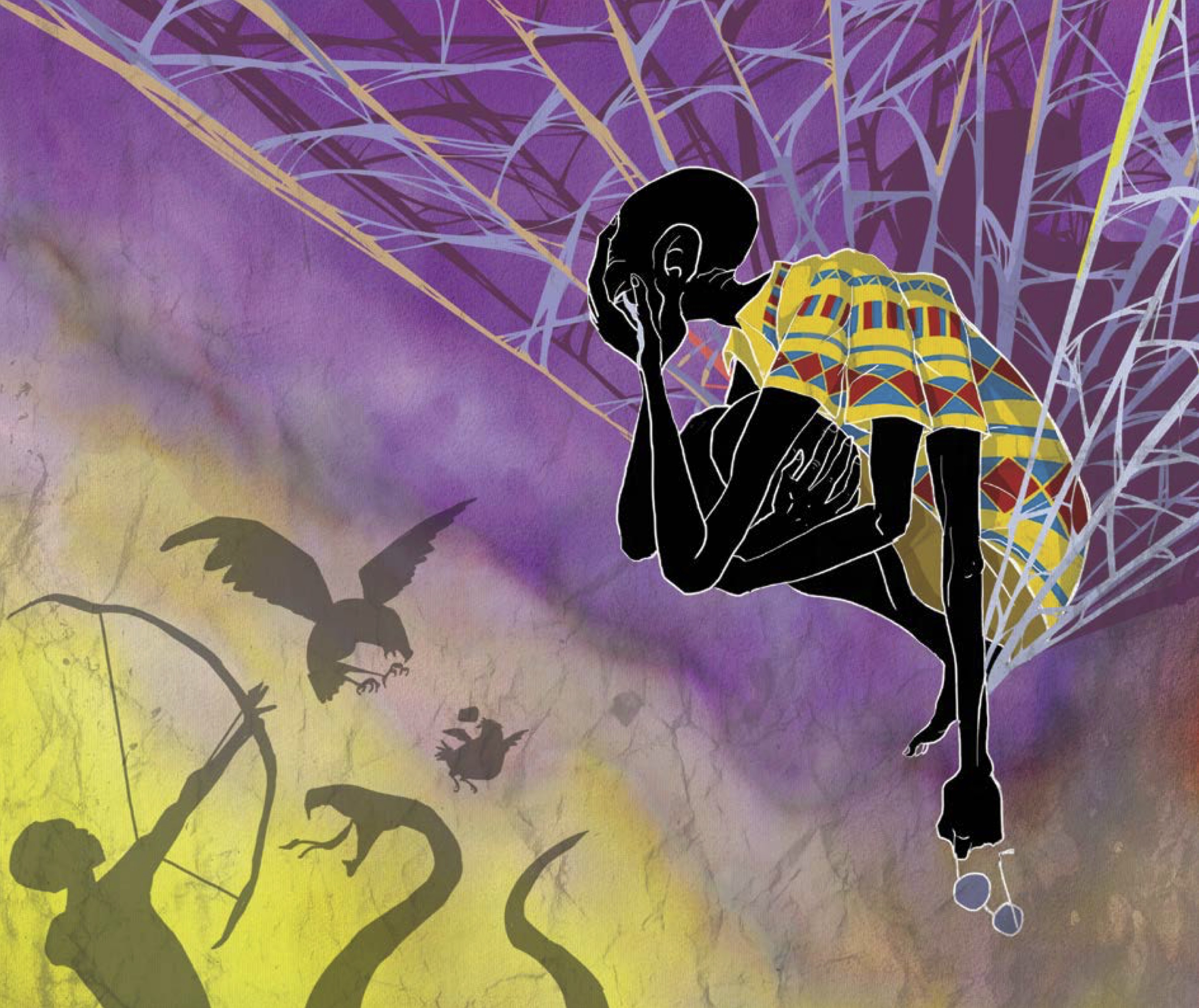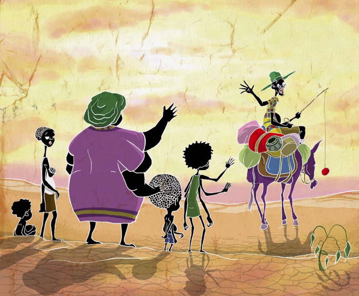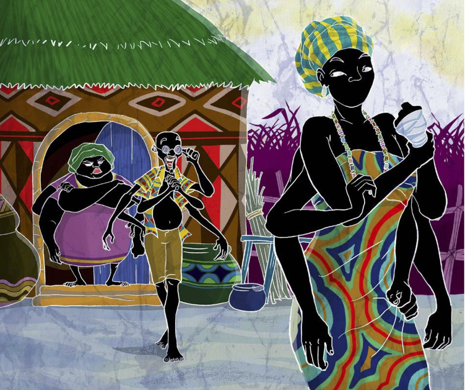 These titles, written by Ghanaian author Abyna-Ansaa Adjei, and published by Frangipani Books Ltd, are collections of stories featuring the endearing trickster character Anansi the Spider. But instead of a spider as traditionally portrayed, the author wanted for the design of the protagonist something far more human. We decided that Anansi should be a human with six arms. During my research into Ghanian art, I discovered that though batik-making originated in Indonesia, Ghana also has a long history of batik-making. With that in mind, plus the knowledge that many traditional Ghanaian paintings often use bright and vivid colors, I created a distinct art style for the illustrations. To get the crackle effect – a feature on many batik art – I experimented with making wet ink washes over crushed sheets of paper, then layering the scanned images of the crackled paper onto the digital artworks.